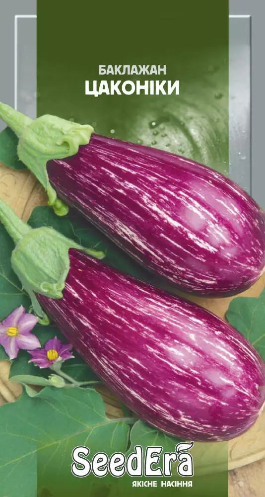 Баклажан Цаконікі – баклажан з новим, смугастим забарвленням та високими смаковими якостями.Від появи масових сходів до технічної стиглості - 70-75 днів. Рослина потужна, заввишки 64-67 см. Формує циліндричні плоди смугастого забарвлення. Довжиною 22-24 см. М'якоть кремово-білий, щільний, без гіркоти. Ідеально підходить для заморожування, консервування та вживання в свіжому вигляді.