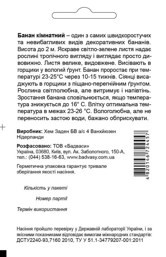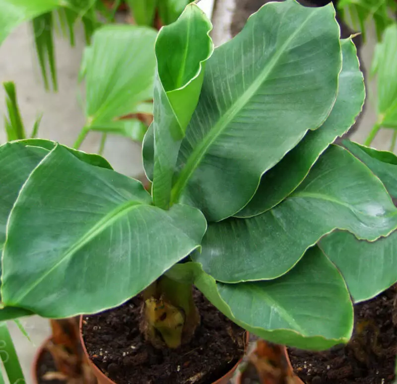 Банан кімнатний – один з самих швидкоростучих та невибагливих видів декоративних бананів. Висота до 2 м. Яскраве світло-зелене листя надає рослині тропічного вигляду і виглядає просто дивовижно. Листя велике, видовжене. Висівають в горщики у вологий ґрунт. Банан проростає при температурі 23-25°С через 10-15 тижнів. Сіянці висаджують в горщики з піщано-перегнійним ґрунтом. Рослина світлолюбна, але витримує і напівтінь. Зростання банана сповільнюється, якщо температура знижується до 16° С. Влітку оптимальна температура в межах 23-26 °С. Вологолюбна, але не переносить застою води, бажано обприскувати.Оплата та доставка