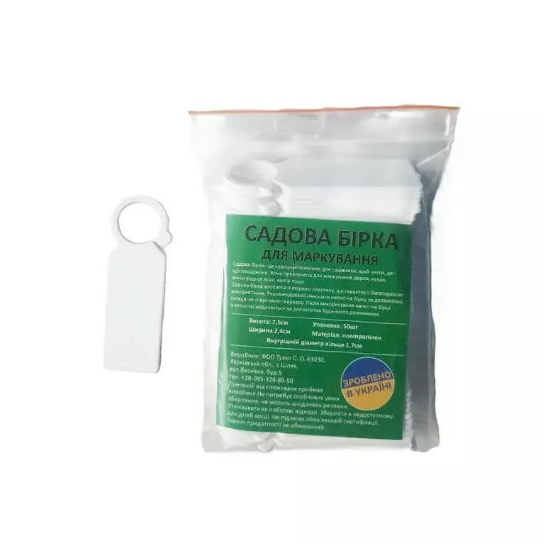 Садова бірка зроблена з міцного пластику, що гарантує її багаторазове використання. Рекомендовано наносити напис на бірку за допомогою олівця чи спиртового маркера. Після використання напис на табличці з легкістю видаляється за допомогою будь-якого розчинника.