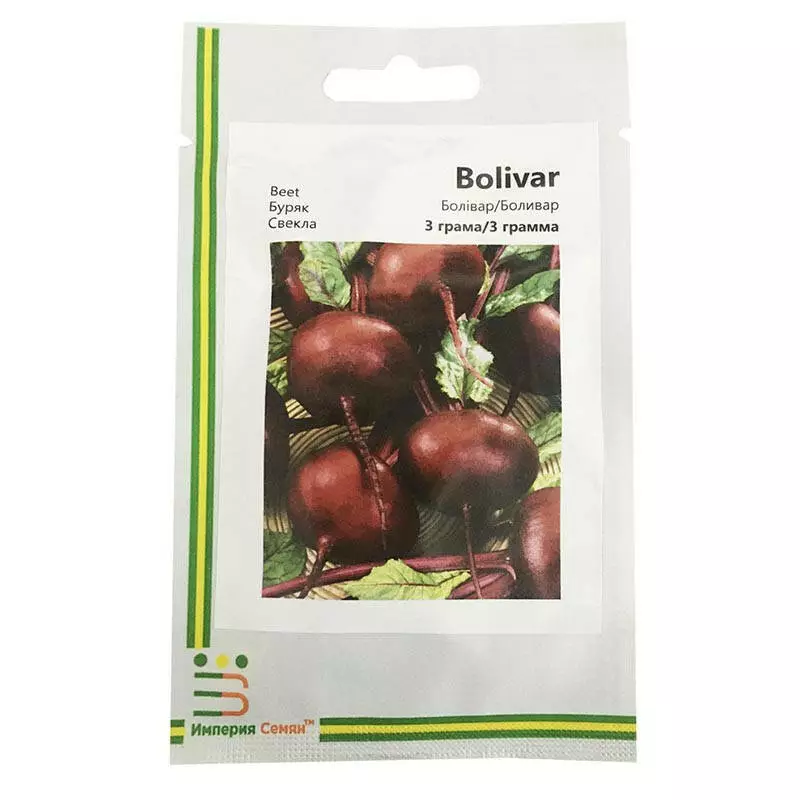 Буряк Болівар - високоврожайний столовий сорт голландської селекції, середньораннього терміну дозрівання. Прибирання проводять вибірково, починаючи з 85 днів від моменту появи сходів. Рослина формує компактну прямостоячу розетку темно-зеленого листя. Цінність сорту в їх однорідності, високих товарних та смакових якостях. Коренеплоди округлої форми, з гладкою та тонкою шкіркою, м'якоть рівномірного темно-червоного кольору без концентричних кілець, вага до 400 грамів. Буряк Болівар придатний для отримання як літнього (раннього) врожаю, так і пізнього (на зберігання). Універсального використання: для вживання у свіжому вигляді, зберігання та переробки.