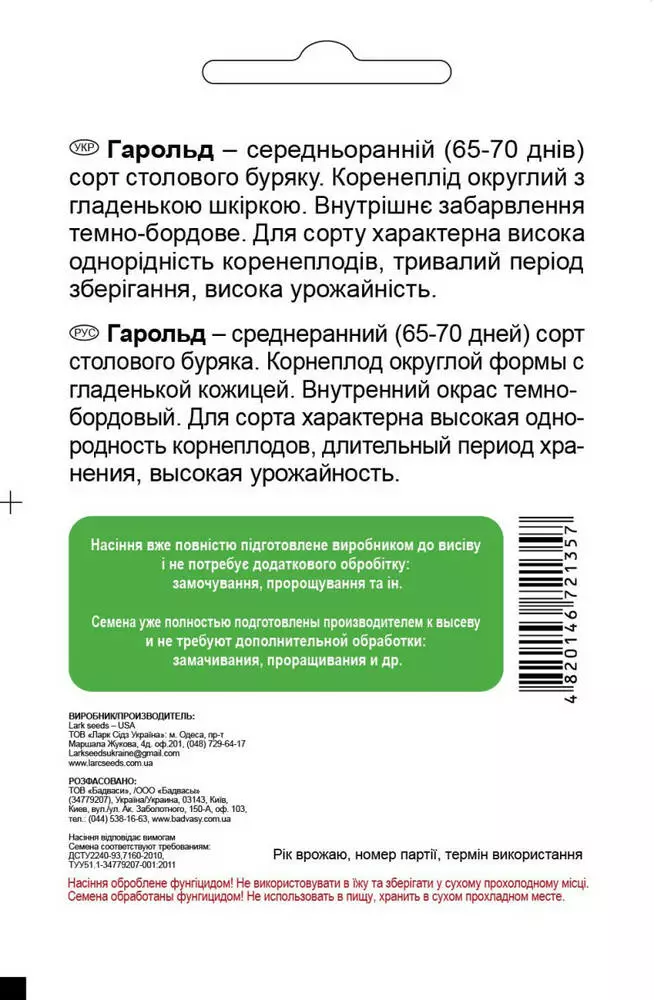 Ранній (65-70 днів) сорт столового буряку. Коренеплід округлий з гладенькою шкіркою. Внутрішнє забарвлення темно-бордове. Для сорту характерна висока однорідність коренеплодів, тривалий період зберігання, висока урожайність.Оплата та доставка