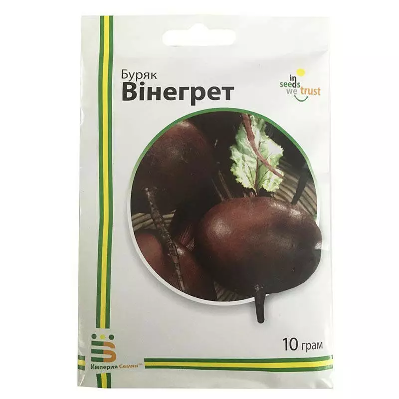 Буряк Вінегрет - столовий ранній сорт. Період від сходів до технічної стиглості 80-115 днів. Коренеплоди правильної округлої форми, масою від 250 до 500 грамів, бордові без білястих кілець. Мають насичений солодкий смак і незамінний для приготування різноманітних салатів, закусок, перших страв, соків. Добре зберігається в зимовий період. Сорт стійкий до перепадів температур і основних захворювань.