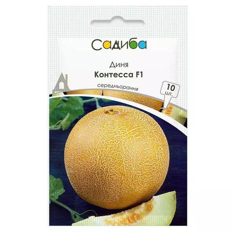 Диня Контесса F1 – середньоранній гібрид (65-70 днів від висадки розсади) типу Галія, призначений для вирощування у відкритому та закритому ґрунті. Рослина має сильний листовий апарат, формує 4-5 динь на кущі та вирізняється стійкістю до посухи та хвороб.