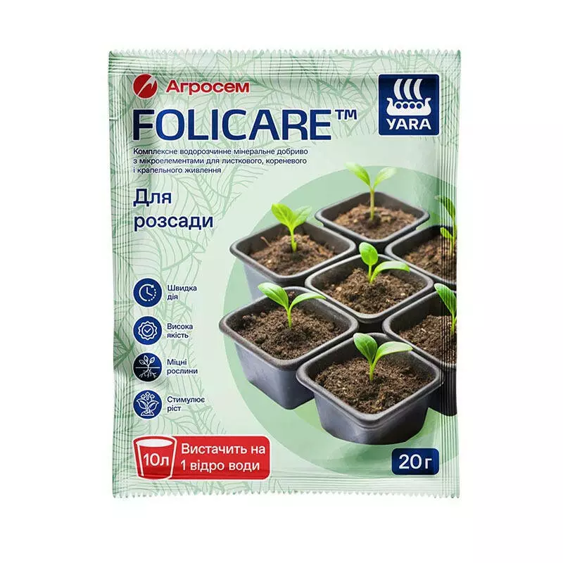 Yara Folicare для розсади — містить ретельно збалансований комплекс макро- і мікроелементів, необхідних для повноцінного росту та розвитку молодих рослин. Воно зміцнює розсаду, підвищує її стійкість і сприяє здоровому старту.