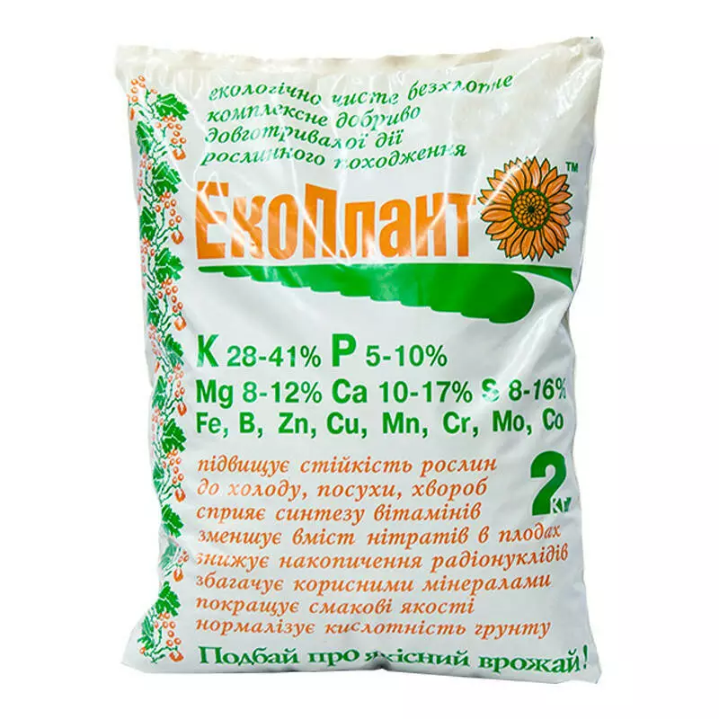 Екоплант – це екологічно чисте, безхлорне, комплексне мінеральне добриво рослинного походження. Основна діюча речовина - калій (К2О) 28-34% в легкодоступній для рослин формі карбонатів (К2СО3) і сульфатів (К2SO4). Вміст фосфору (P2O5) становить 4-7 %.