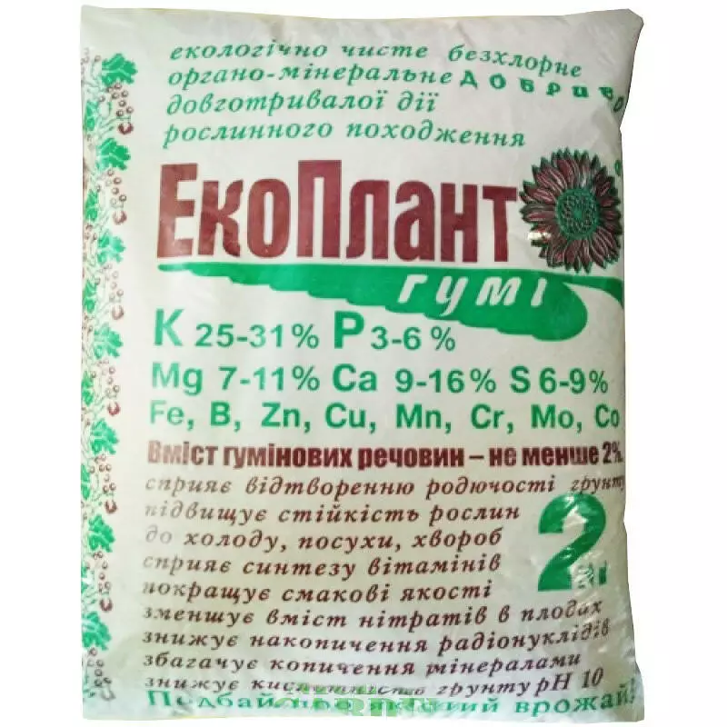 Екоплант – це екологічно чисте, безхлорне, комплексне мінеральне добриво рослинного походження. Основна діюча речовина - калій (К2О) 28-34% в легкодоступній для рослин формі карбонатів (К2СО3) і сульфатів (К2SO4). Вміст фосфору (P2O5) становить 4-7 %.Екоплант містить й інші важливі макроелементи: магній (МgО) 8-12%, кальцій (СаО) 10-17%, сірка (SО3) 6-9%; а також мікроелементи: Fe, B, Zn, Cu, Mn, Сr, Mo, Co. Cумарний вміст елементів живлення складає не менше 70%. Завдяки наявності цих елементів Екоплант є комплексним універсальним мінеральним добривом для застосування під усі сільськогосподарські культури. Особливо ефективний на кислих грунтах, бо він володіє високою нейтралізуючою здатністю, до того ж має суттєвий ефект післядії на наступний рік.
