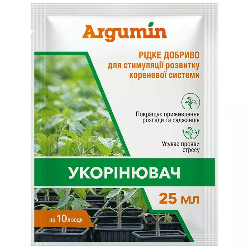 Добриво Укорінювач - високоефективне універсальне рідке добриво для стимуляції проростання та розвитку кореневої системи рослин. Використовується для вкорінення розсади овочевих та саджанців плодових, ягідних, декоративних і квіткових культур. Забезпечує формування міцної кореневої системи, збільшує довжину корінців та їх площу. Фосфор та фітогормон ауксин забезпечують швидкий ріст та стресостійкість.