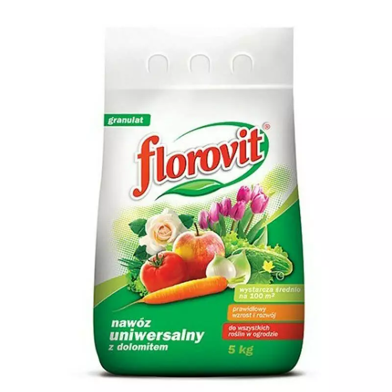 Флоровіт універсальний - добриво з доломітом N: P: К-11,4: 9,2: 16,8. До складу також входить: сірка, магній, бор, мідь, молібден. Добриво містить набір поживних компонентів у відповідних пропорціях, необхідних для правильного росту і розвитку ряду груп рослин. Використання добрива гарантує отримання повноцінних плодів і чудовий зовнішній вигляд квітів, декоративних дерев і чагарників. Переваги використання добрива: - забезпечує рівномірне зростання і розвиток рослин, а також покращує цвітіння і плодоношення. - містить повний набір поживних компонентів, а також доломіт, завдяки чому виявляє легку окисляє дію.
