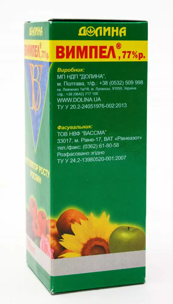 Регулятор росту Вимпел - покращує ріст і розвиток рослин, ступінь приживлюваності, сприяє активному розвитку кореневої системи, що збільшує урожай на 10-30%. Вимпел має яскраво виражений ефект прилипача, стимулює процес проростання насіння, захищає насіння при їх довготривалому перебуванні в несприятливих умовах, підвищує польову схожість насіння, сприяє активному розвитку кореневої системи, що особливо необхідно в осінній період розвитку рослини. Покращує транспортабельність, товарний вигляд плодів, ягід та овочів.