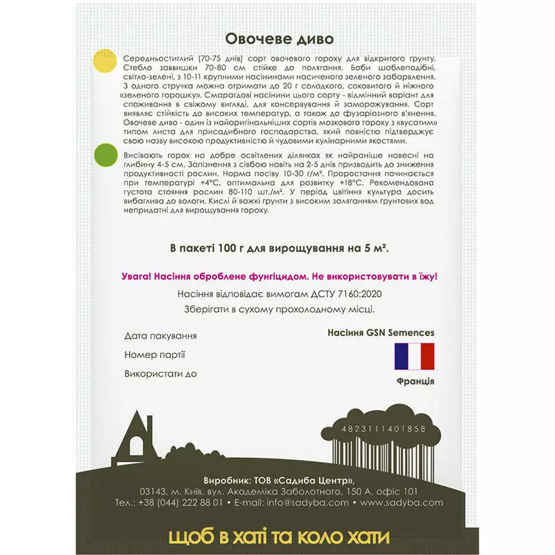Сорт середньоранній, високоврожайний. Від сходів до початку збирання 70 - 75 днів. Висота рослини 50 - 70 см. У рослин здорові темно – зелені стебла. Формує довгі світло - зелені боби з 9 - 10 горошинами, з мозговою поверхнею, сплюснутою з боків. Зелений горошок однорідний, яскраво - зеленого кольору з добрими смаковими якостями масою до 20г з стрючка. Сорт стійкий до високих температур. Використовують в свіжому вигляді та для консервування. Культура холодостійка. Насіння висівають у ранні строки, при настанні фізіологічної стиглості ґрунту, загортаючи на глибину 4 - 6 см. Норма висіву 8 - 10 насінин на 1пог.м, ширина міжрядь 15 см, глибина заробки насіння 5 - 6 см. Сходи переносять весняні приморозки.Оплата та доставка