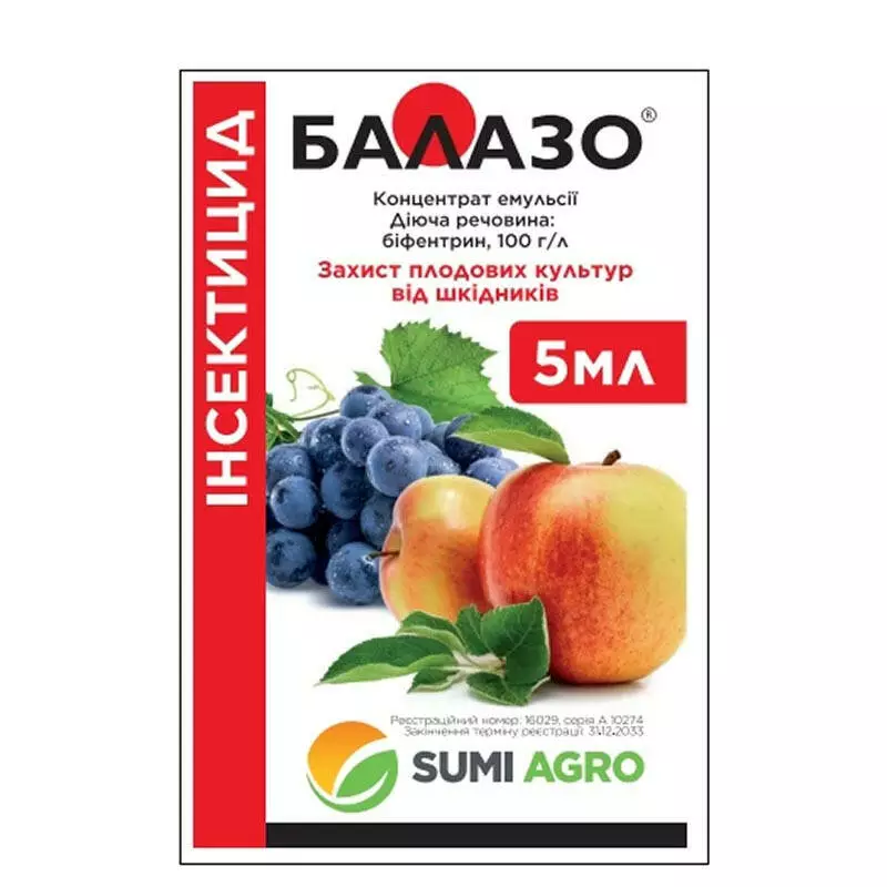 Балазо – це піретроїдний інсектицид контактно-шлункової дії, який діє на нервову систему комах, спричиняючи параліч комах з їх подальшою загибеллю. Балазо володіє широким спектром дії і контролює личинок каліфорнійської щитівки і листомінуючих молей, гусениць яблуневої плодожерки, личинок і дорослих особин попелиць, клопів та інших видів комах. Препарат також діє проти плодового червоного кліща.
