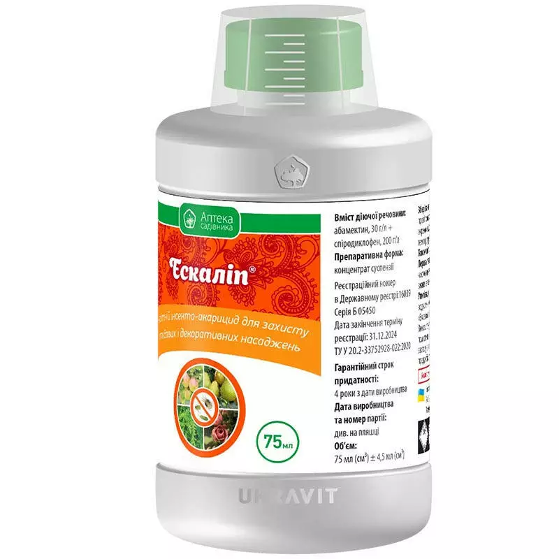 Інсектицид Ескаліп – це високоефективний інсектицид, який захищає плодові і декоративні насадження від широкого спектру різних видів кліщів, а також окремих сисних і мінуючих шкідників.