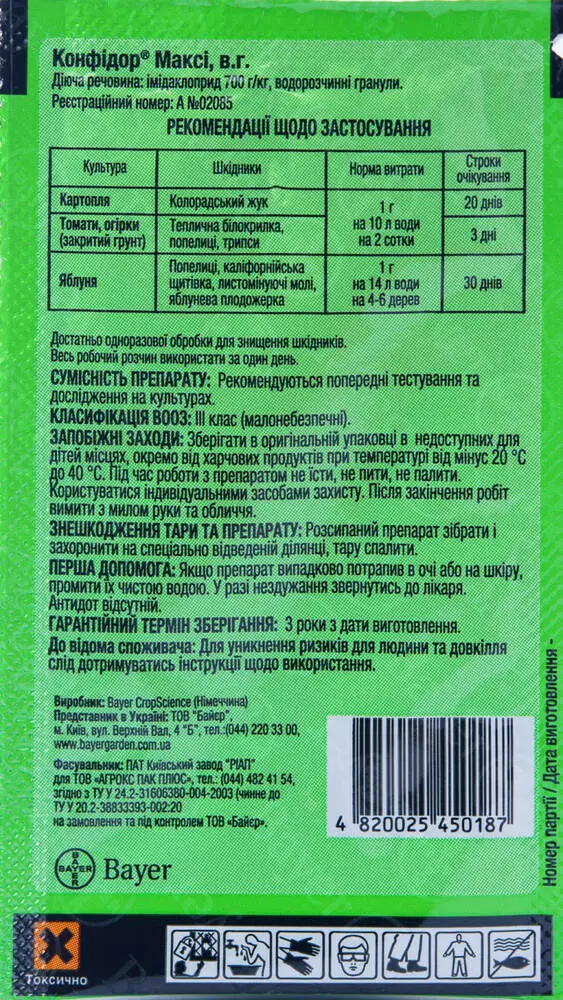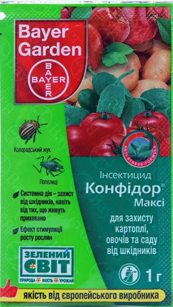 Конфідор Максі - являє собою високоефективний малотоксичний інсектицид системної і контактної дії проти широкого спектра шкідників з дуже тривалим захистом. Перевага Конфідора Максі полягає в його новому механізмі дії на комах, проти якого відсутня резистентність. Препарат малотоксичний для теплокровних і безпечний для навколишнього середовища.