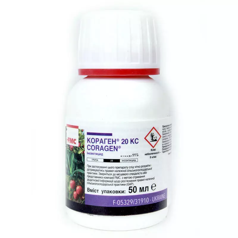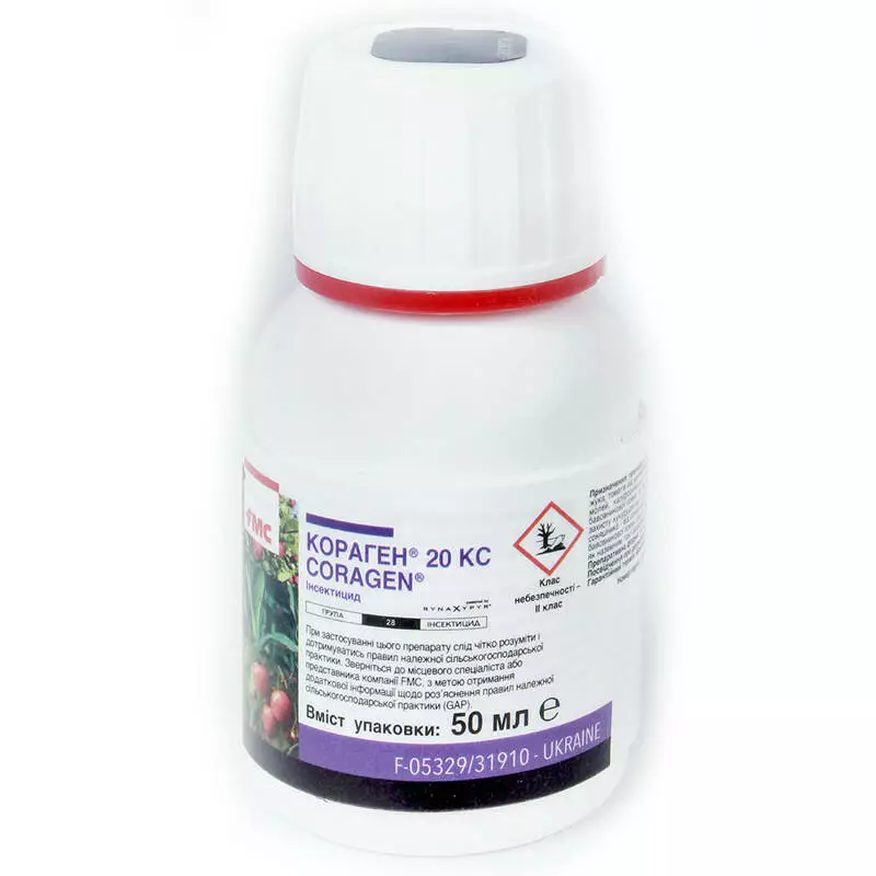 Механізм дії: Основна дія препарату відбувається при потраплянні Корагену до шлунку комах, а також через кутикулу (контактна дія). Кораген активує рианідинрецепторні гени, які відіграють ключову роль в скороченні м’язів. Після прийому Корагену активізується виведення внутрішніх запасів кальцію з м’язів шкідника. Неконтрольоване виведення іонів кальцію різко зменшує його внутрішні запаси в організмі. Внаслідок цього шкідник втрачає здатність скорочувати м’язи і миттєво настає параліч. В свою чергу це призводить до зупинки харчування, личинки стають слабкими та невдовзі гинуть.