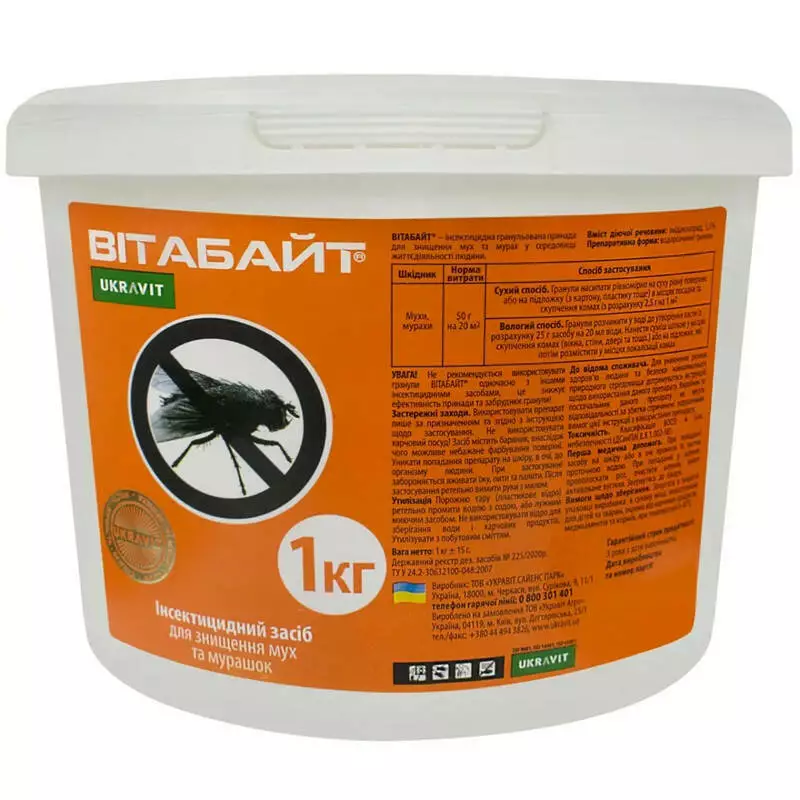 Вітабайт – це високоефективна та універсальна приманка для знищення мух, садових та будинкових мурах. Препарат представлений у вигляді гранул, які забезпечують миттєву контактно-кишкову дію на шкідників.