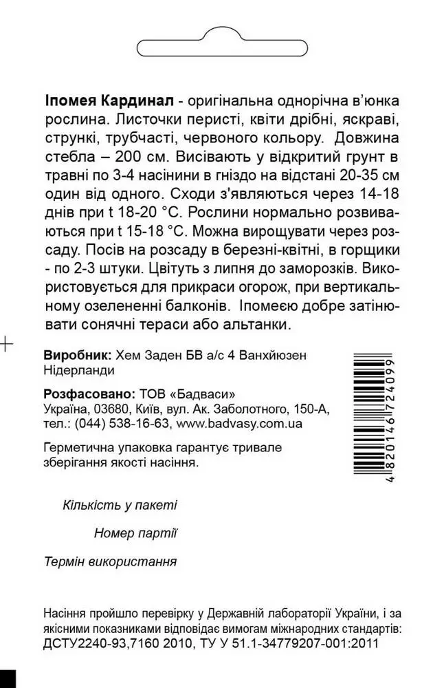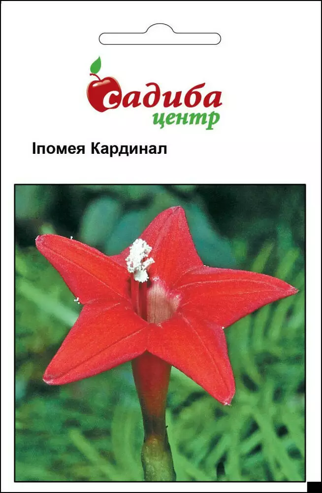 Іпомея Кардинал - оригінальна однорічна в’юнка рослина. Листочки перисті, квіти дрібні, яскраві, стрункі, трубчасті, червоного кольору. Довжина стебла – 200 см.Висівають у відкритий грунт в травні по 3-4 насінини в гніздо на відстані 20-35 см один від одного. Сходи з'являються через 14-18 днів при t 18-20° С. Рослини нормально розвиваються при t 15-18 ° С. Можна вирощувати через розсаду. Посів на розсаду в березні-квітні, в горщики - по 2-3 штуки. Цвітуть з липня до заморозків. Використовується для прикраси огорож, при вертикальному озелененні балконів. Іпомеєю добре затінювати сонячні тераси або альтанки.