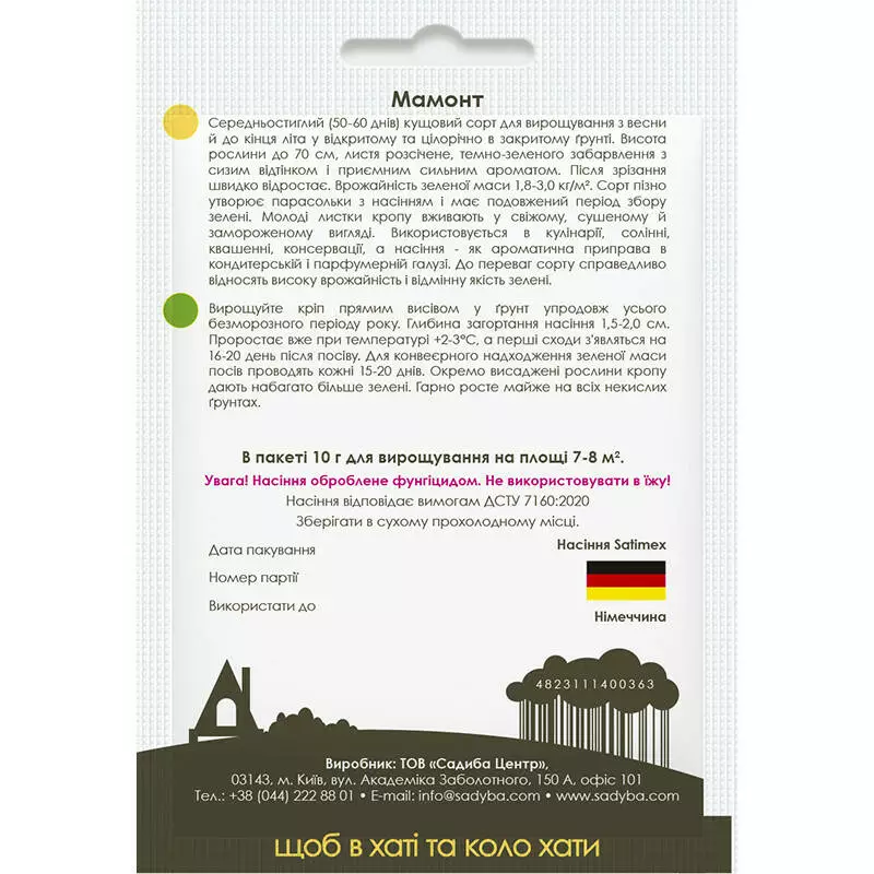 Кущовий, пізній сорт для відкритого і закритого грунту. Характеризується тривалим періодом збору зелені. Листя великі темно-зеленого кольору, дуже ароматні. Для виробництва товарної продукції круглий рік. Потребує легких, помірно вологих, удобрених ґрунтів. Висівати рано навесні, влітку, восени або під зиму на глибину 2-3 см, в теплиці - конвеєрно протягом року.Оплата та доставка