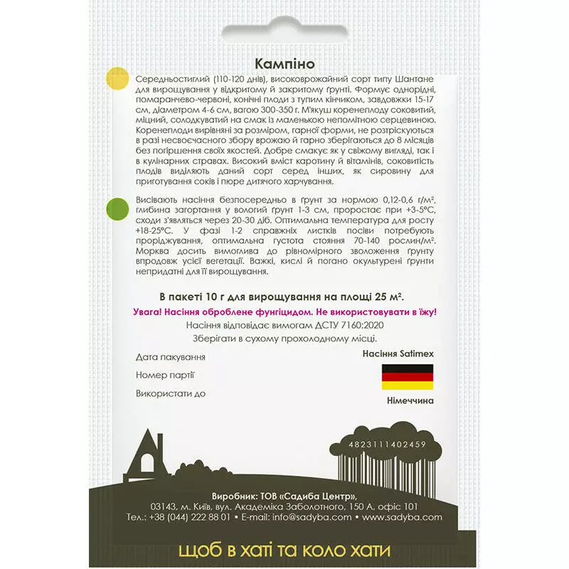 Кампіно - коренеплоди конічної форми з тупим кінчиком, 12 - 15 см, вагою 300 - 450 г, насичено помаранчевого кольору. Сорт стійкий до розтріскування та має чудові смакові якості. Для тривалого зберігання, споживання у свіжому вигляді та переробки.Оплата та доставка