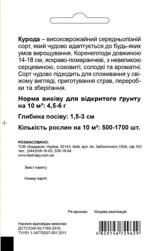 Популярний ранній сорт моркви (105 днів). Високий товарний урожай. Вирізняється широкою адаптованість до умов вирощування. Коренеплоди товсті, однорідні, тверді, привабливого насичено оранжевого кольору, високих смакових якостей. Відмінно зберігаються в поле. Довжина коренеплоду - 20 см. Серцевина маленька. Толерантний до спеки, стрелкованию і хвороб. Використовується для вживання в свіжому вигляді і переробки. При посіві в кінці липня і зборі врожаю на початку листопада коренеплоди зберігаються до квітня-травня наступного року.Оплата та доставка