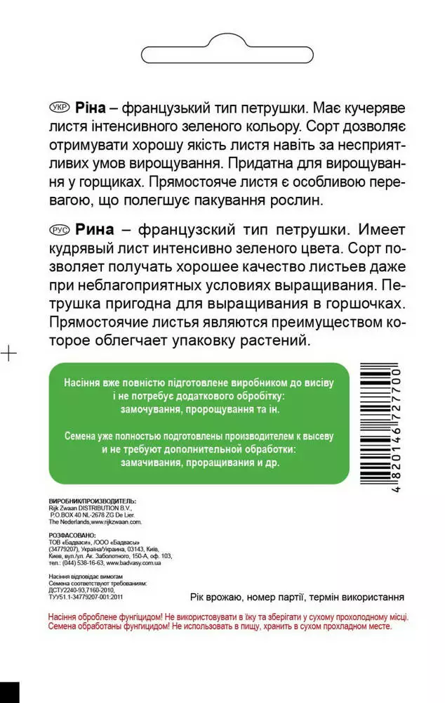 Французький тип петрушки. Має кучеряве листя інтенсивного зеленого кольору. Сорт дозволяє отримувати хорошу якість листя навіть за несприятливих умов вирощування. Придатна для вирощування у горщиках. Прямостояче листя є особливою перевагою, що полегшує пакування рослин.Оплата та доставка