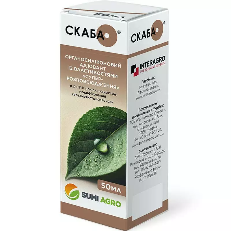 Скаба – це високоефективний засіб, який застосовується у сільському господарстві разом з пестицидами для забезпечення їх кращого прилипання до листя рослин, збільшення проникності активних речовин через оболонки клітин шкідників або збудників хвороб. Це дозволяє знизити дозування основних препаратів без втрати їхньої ефективності, а також сприяє економії коштів та зменшенню негативного впливу на довкілля.