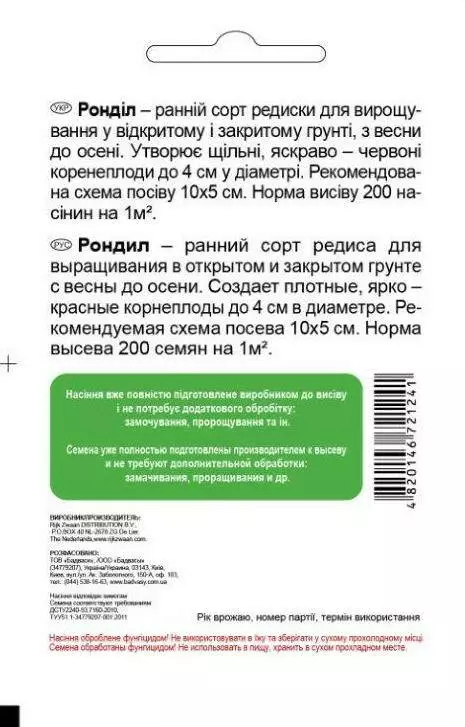 Ранній сорт редиски для вирощування у відкритому і закритому грунті, з весни до осені. Утворює щільні, яскраво – червоні коренеплоди до 4 см у діаметрі. Рекомендована схема посіву 10х5 см. Норма висіву 200 насінин на 1м².Оплата та доставка