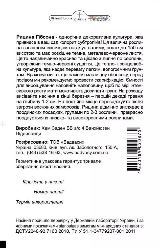 Рицина Гібсона - однорічна декоративна культура, яка привнесе в ваш сад колорит субтропіків! Ця велична рослина зовнішнім виглядом нагадує пальму, росте до 150 см висотою та має розкішне темне, металево-червоне листя. Цвіте надзвичайно красиво та цікаво з липня по серпень, утворюючи темно-червоні суцвіття. Це тепло- і сонцелюбна культура, яка надає перевагу рихлим, вологоємним ґрунтам. Враховуючи те, що насіння має міцну оболонку, перед посівом ми рекомендуємо провести скарифікацію (злегка пошкодити насіннєву оболонку). Ємності для вирощування наповніть ґрунтом наполовину, щоб по мірі інтенсивного росту мати можливість досипати землю. На розсаду висівайте насіння в кінці березня – першій декаді травня на глибину 1-2 см. На постійне місце пересаджуйте після загрози весняних заморозків, обираючи сонячні ділянки. Рицина відмінно виглядає в одиночних посадках, групами по 2-3 рослини, прекрасно поєднується із низько- та високорослими рослинами.Оплата та доставка