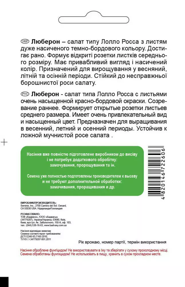 Салат типу Лолло Росса з листям дуже насиченого темно-бордового кольору. Достигає рано. Формує відкриті розетки листків середнього розміру. Має привабливий вигляд і насичений колір. Призначений для вирощування у весняний, літній та осінній періоди. Стійкий до несправжньої борошнистої роси салату.Оплата та доставка