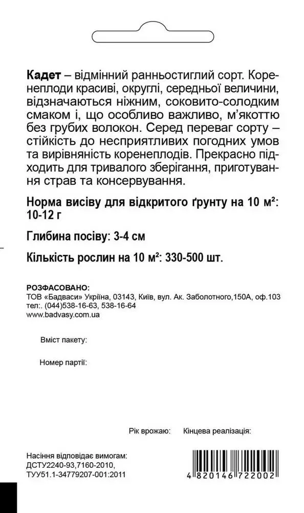 Відмінний ранній сорт. Коренеплоди красиві, округлі, середньої величини, відзначаються ніжним, соковито-солодким смаком і, що особливо важливо, м’якоттю без губих волокон. Серед переваг сорту - стійкість до несприятливих погодних умов. Прекрасно підходить для тривалого зберігання та приготування домашніх страв.Оплата та доставка
