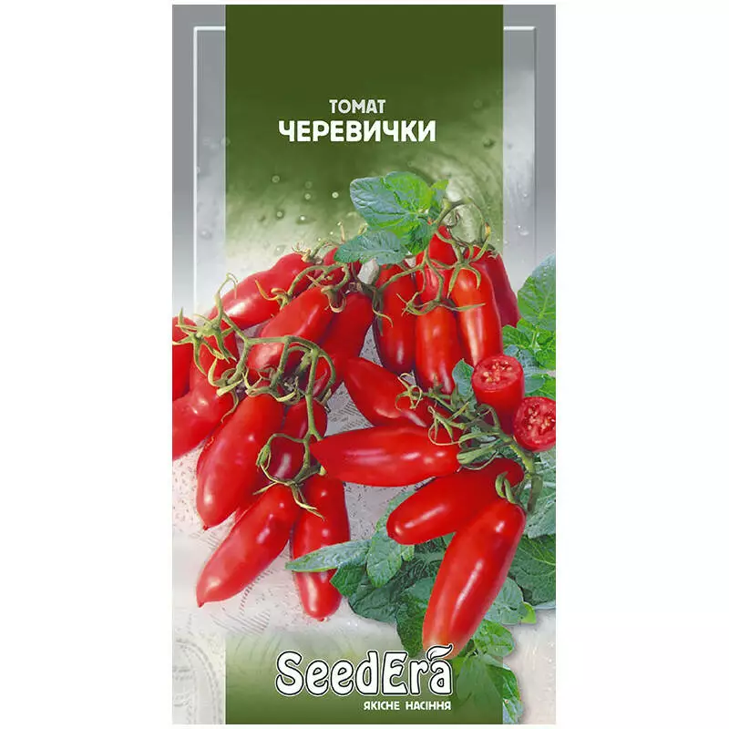 Томат Черевички - це індетермінантний сорт. Плід – сливка, за