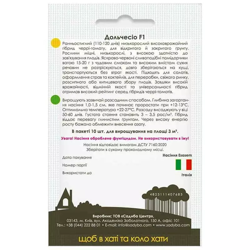 Томат Дольчесіо F1 – ранньостиглий (110-120 днів) низькорослий гібрид черрі-томатів, який поєднує високу врожайність, чудовий смак і привабливий зовнішній вигляд. Рослини міцні, низькорослі, з компактною кущовою формою та високою здатністю до зав’язування плодів. Плоди мають сливоподібну форму, яскраво-червоне забарвлення та вагу від 15 до 20 грамів. Шкірка тонка, але щільна, це робить томати стійкими до розтріскування та сприяє тривалому зберіганню. М'якуш соковитий, з чудовим солодким смаком і високим вмістом сухих речовин.