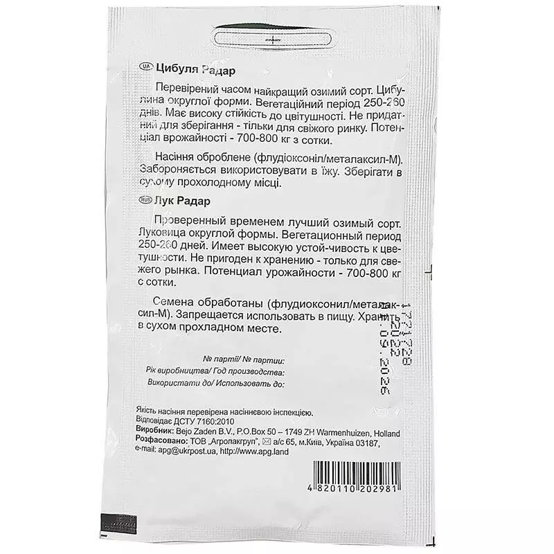 Цибуля Радар - один з кращих і надійних сортів цибулі для підзимнього посіву, середньостиглий, період вегетації триває 250-260 днів. Цибулини округлі, зовнішні луски золотисті, внутрішні білі, середньо гострі, ароматні. Середня маса дорослої цибулини: 200 – 350 грам. Смак напівгострий. Використовується для споживання у свіжому вигляді, у супах та стравах зі свіжих овочів. Не придатний для зберігання - тільки для свіжого ринку.
