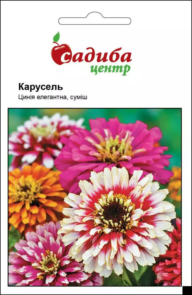 Цинія Карусель - однорічна швидкоростуча рослина висотою 50 см. Суцвіття великі, 7-10 см в діаметрі, з білими краями. Насіння висівають у парники в квітні. Сходи з'являються на 4 - 6 день. Пікірують один раз. На постійне місце висаджують на відстані 20 - 35 см. Можна висівати безпосередньо на постійне місце наприкінці квітня - початку травня. Цвіте рясно і тривало, з середини червня до морозів. Теплолюбна, найкраще росте на відкритих сонячних місцях, родючих ґрунтах і при рясному поливі. Вирощують на клумбах, рабатках, в групових посадках і для зрізу.Оплата та доставка