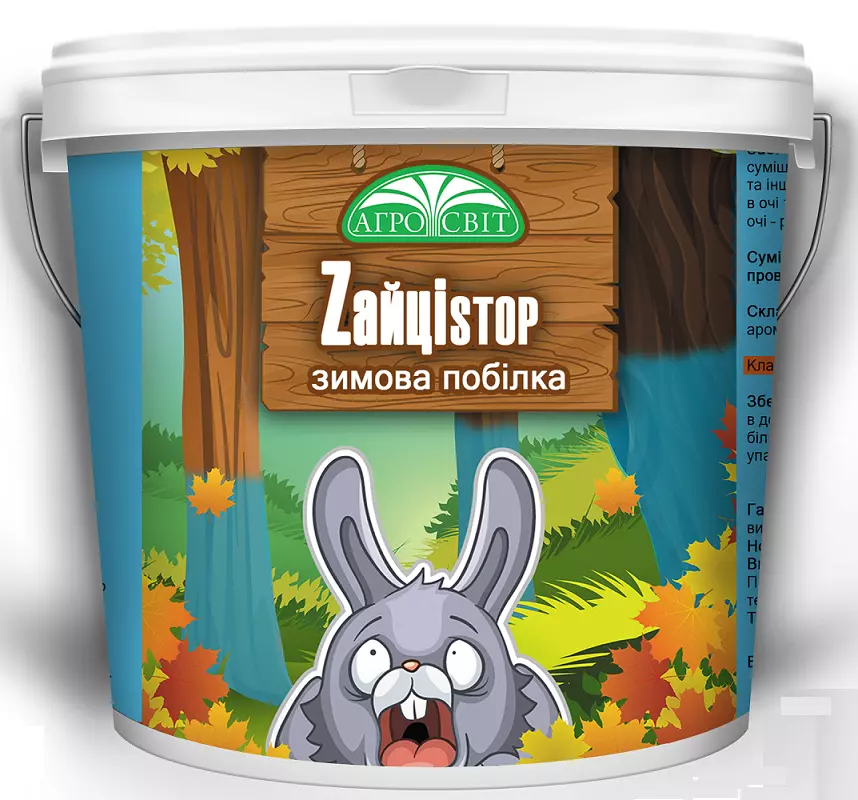 “Zайцістоп” - зимова побілка і одночасно захист саджанців від зайців та інших гризунів, що надає декоративно-естетичного вигляду вашому саду. Продукт екологічно чистий та безпечний для довкілля. Шляхом відлякування зайців та гризунів, забезпечує захист дерев та молодих саджанців на вашій садовій ділянці. Суміш рекомендовано для проведення осінніх оздоблювальних робіт на території садових, паркових зон, лісосмуг, приватних садиб шляхом фарбування стовбурів, скелетних гілок плодових, декоративних насаджень. Спосіб застосування: 1,5кг пастоподібної суміші поміщається в пластиковій контейнер об’ємом 8-10л. до суміші додається 1,5л води, ретельно перемішується, додається ще 3-4 л води, знову ретельно перемішується. суміш готова до використання. Рекомендовано використовувати за температури повітря не нижче +3ºСОплата та доставка